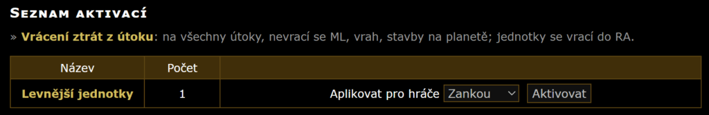 | Univerzálové | Přidá k základním statistikám +10 do útoků a obrany. Maximálně lze aktivovat 3 krát. Možnost nákupu je umožněna jednou za 1 den. |