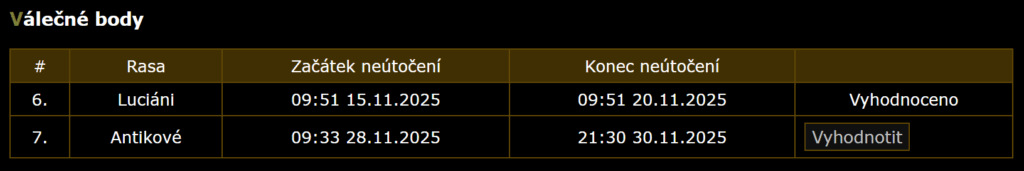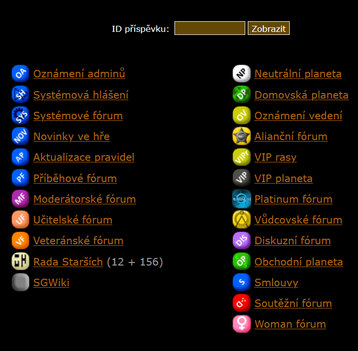 | Veterán | Status Veterán přiděluje Admin hry. Tento status podléhá pravidlu 10. Veteráni – ve zkratce se jedná o hráče, který prokazatelně odehrál stanovený počet věků ve hratelné rase. Hráč ze statusem Veterán má přistup na Veteránsky fórum a na VIP fórum bez nutnosti být členem vlády. |